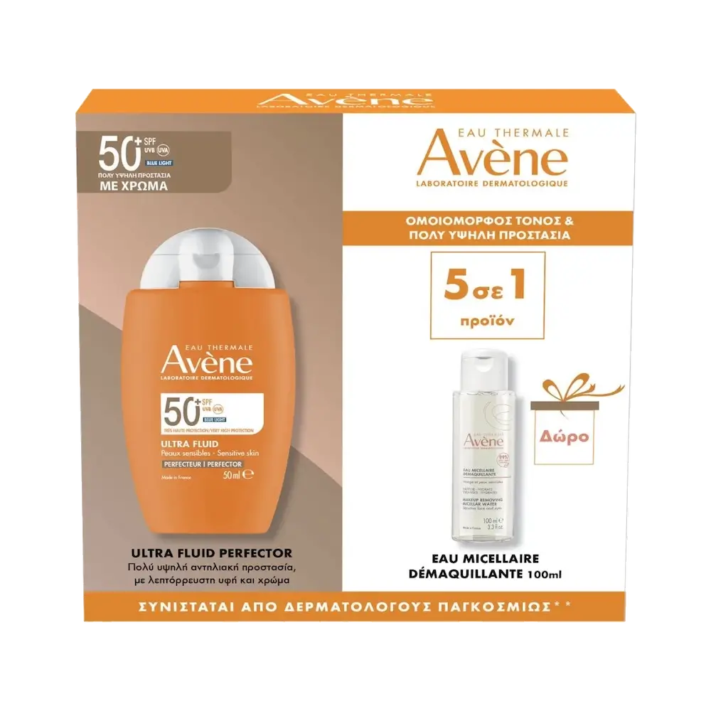 AVENE SOLAIRE ULTRA FLUID TEINTE SPF 50 ΑΝΤΗΛΙΑΚΉ ΠΡΟΣΏΠΟΥ ΜΕ ΧΡΏΜΑ (50ml) + EAU MICELLAIRE DEMAQUILLANTE (100ml) ΔΩΡΟ