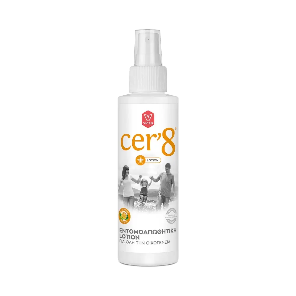 Η εντομοαπωθητική Cer’8 Lotion χάρη στη μοναδική σύνθεσή της προφυλάσσει αποτελεσματικά από τα ενοχλητικά τσιμπήματα των κουνουπιών, αφήνοντας στο δέρμα ευχάριστο άρωμα κίτρου. Είναι κατάλληλη για μεγάλο πλήθος από είδη κουνουπιών συμπεριλαμβανομένου και του ασιατικού κουνουπιού “τίγρης”, καθώς και για σκνίπες.